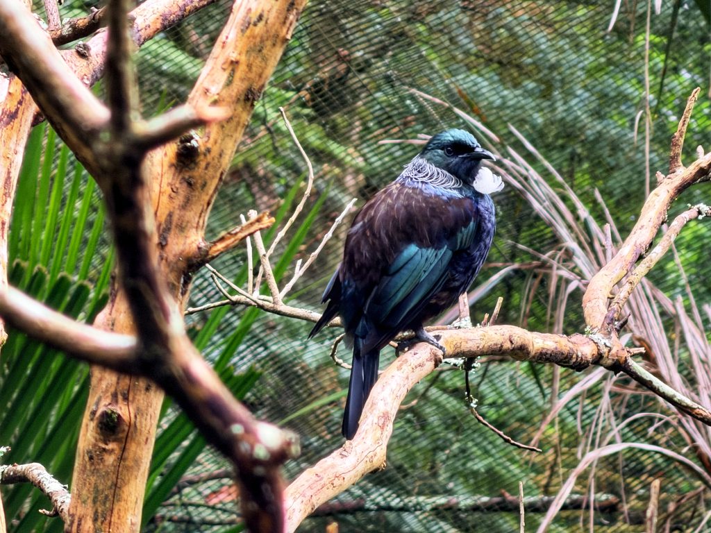 走出奇异鸟馆后,我们来到了新西兰本地森林鸟展区。这里是露天的,郁郁葱葱的树木和灌木让人仿佛置身原始森林。鸟儿似乎都藏了起来,只能听到不时传来的各种奇妙鸣叫。忽然抬头,一只鸟地站在树梢上——看了说明牌才知道,它叫图伊鸟(Tui)。图伊鸟是新西兰特有的鸟类,羽毛在阳光下闪耀着蓝绿金属光泽,喉下还长着一对可爱的白色羽球,像系着一对小毛球装饰。它的叫声丰富多变,能模仿其他鸟甚至人声和手机铃声,是新西兰森林里最有“音乐感”的精灵之一。