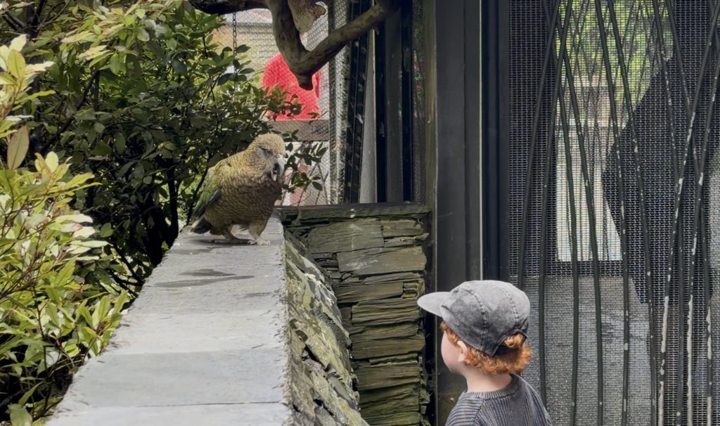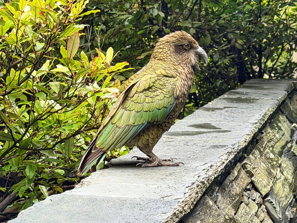 As I was photographing one of the keas quietly perched on a treetop, it suddenly decided to fly down and landed on a platform right in front of me, pacing back and forth. Visitors quickly gathered around to take pictures. A mischievous little boy nearby let out a small roar at it, and the kea immediately squawked back, startling him into running off. A moment later, the boy came running back and forth again, and each time, the bird recognized him and called out—an endlessly amusing exchange.