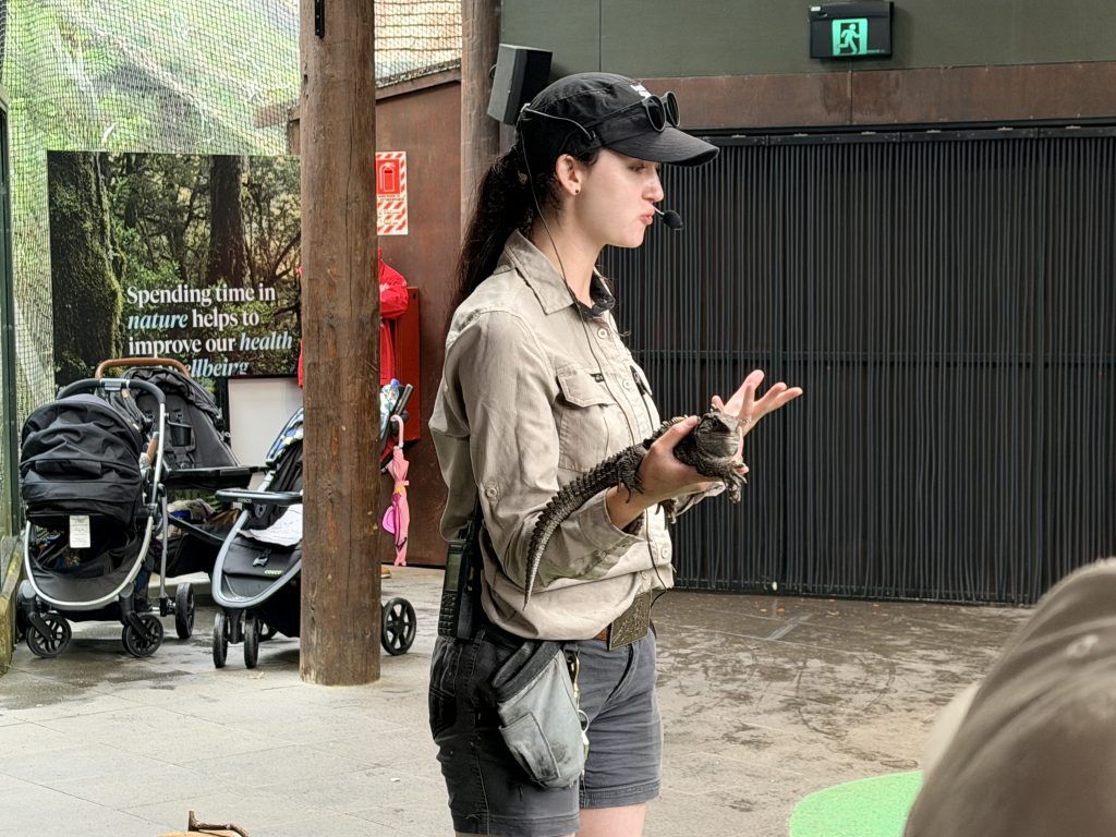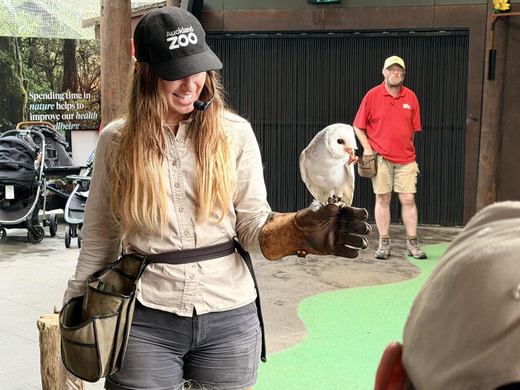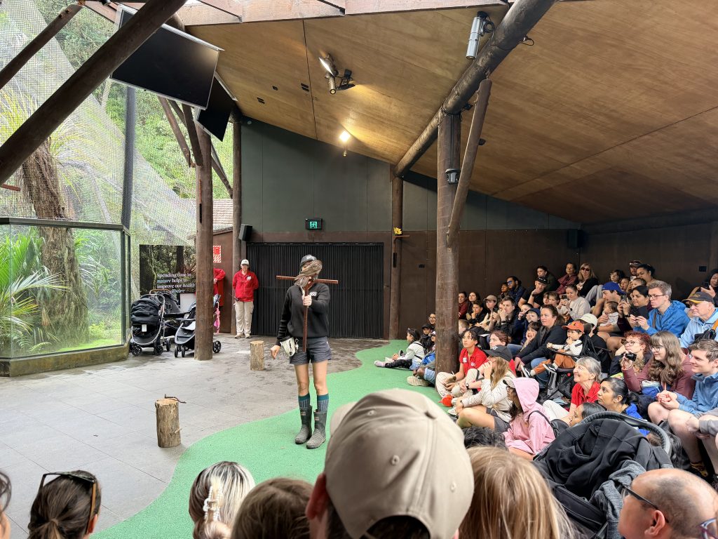 While we were watching the kea, a zookeeper came over and told us that a bird show was about to begin. We immediately joined. The staff introduced visitors to some of New Zealand’s unique birds and animals.